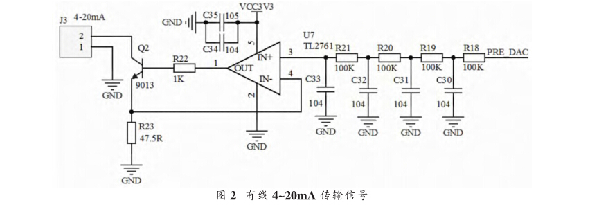 有線傳輸模塊信號(hào)為4~20mA的電流信號(hào)。如圖2所 示,CPU將采集到的壓力值轉(zhuǎn)化為電壓信號(hào),電壓信號(hào)進(jìn) 行4級(jí)濾波處理,到達(dá)運(yùn)算放大器的輸入端。運(yùn)算放大器 輸出端控制NPN三極管輸出電流信號(hào)。電流值為運(yùn)算放 大器U7同相輸入端(3卿電壓與R23的比值。