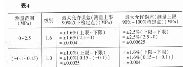 JJG52-2013中規(guī)定,壓力表的示值誤差應(yīng)不超過(guò)JJG52-2013中表1所規(guī)定的示值誤差,由于壓力表誤 差使用的是引用誤差,這句話理解起來(lái)就是壓力表每 個(gè)檢定點(diǎn)測(cè)量上限的90%~100%的檢定點(diǎn)除外)的示 值誤差都不超過(guò)固定的按壓力表標(biāo)明的級(jí)別計(jì)算的 最大允許誤差值,測(cè)量上限的90%~100%的檢定點(diǎn)最 大允許誤差按標(biāo)明級(jí)別的低一級(jí)別計(jì)算。規(guī)程中表1 注2規(guī)定,壓力表的最大允許誤差按其量程的百分比 計(jì)算。壓力表最大允許誤差的計(jì)算通過(guò)舉兩個(gè)典型測(cè) 量范圍例子說(shuō)明見(jiàn)表4)。