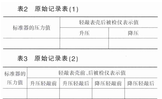 時(shí),從零點(diǎn)開(kāi)始均勻緩慢地加壓至第一個(gè)檢定點(diǎn)即 標(biāo)準(zhǔn)器的示值),然后讀取被檢壓力表的示值按分度 值1/5估讀),接著用手指輕敲一下壓力表外殼,再讀 取被檢壓力表的示值并進(jìn)行記錄,輕敲前、后被檢壓 力表示值與標(biāo)準(zhǔn)器示值之差為該檢定點(diǎn)的示值誤差。 由此可見(jiàn),某點(diǎn)的示值誤差需要記錄輕敲前后的示值 并減去標(biāo)準(zhǔn)壓力值,而規(guī)程附錄A中只設(shè)計(jì)了記錄輕 敲表格后的示值,這就造成最大示值誤差不太好計(jì) 算,甚至造成從原始記錄中不能反映實(shí)際的最大允許 誤差,建議把該部分原始記錄表2樣式改為表3樣式。