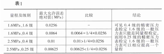 1) 按照J(rèn)JG52-2013彈性元件式一般壓力表、壓 力真空表和真空表檢定規(guī)程》.1.1節(jié)對(duì)標(biāo)準(zhǔn)器的要 求,標(biāo)準(zhǔn)器的最大允許誤差的絕對(duì)值應(yīng)不大于被檢表 最大允許誤差絕對(duì)值的1/4,0.4級(jí)精密壓力表無(wú)法完 成對(duì)1.0級(jí)一般壓力表的檢定,或者需要多只0.4級(jí)精 密壓力表才能完成對(duì)一只壓力表的檢定,非常不方 便,如果客戶有一批壓力表要送檢其中包含1.0級(jí)) 便無(wú)法滿足客戶要求。2)對(duì)于市場(chǎng)上比較普遍的壓 力表,根據(jù)7.1.1對(duì)標(biāo)準(zhǔn)器的要求,0.4級(jí)精密壓力表只 能檢定同樣量程的1.6級(jí)壓力表,而0.25級(jí)的精密壓力 表檢定1.6級(jí)的壓力表可提高一個(gè)量程,這樣在對(duì)壓 力表測(cè)量上限值的檢定時(shí)就不需要把精密壓力表也 升壓到上限值,對(duì)保護(hù)精密壓力表大有好處,特別是 對(duì)于使用頻繁的精密壓力表,可延長(zhǎng)其使用壽命。舉 例如表1所示。