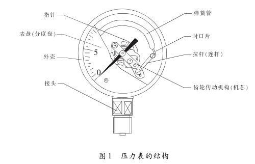 壓力表的基本結(jié)構(gòu)由接頭、彈黃官、齒輪傳動機構(gòu)、 指示機構(gòu)和外殼等部分組成,如圖1所示。