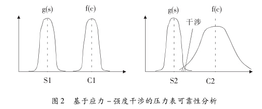 假設壓力表零件的強度為C,所受的應力為S,它們 都是隨機變量,并且概率密度函數(shù)分別為f (c)與g (s)。 當兩個分布的方差很小時,零件強度的最小值大于應力 的最大值,能夠保證一定的安全裕度。壓力表投入使用 后,盡管產(chǎn)品質(zhì)量、承受載荷、環(huán)境溫度、環(huán)境振動、材料 腐蝕等因素的影響帶有隨機性質(zhì),但總體趨勢使得零件 的強度C逐漸下降,偏離設計時的理想?yún)^(qū)間,導致f (c) 與g(s)曲線出現(xiàn)重合,最終產(chǎn)生故障。