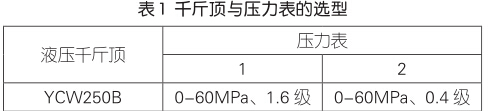 倘若檢定條件相同,則選擇準確度等級不同的壓力表會 對液壓千斤頂?shù)臏y量精度產(chǎn)生影響。下面,筆者列舉不同等 級的壓力表,以探討其對液壓千斤頂檢定示值的影響。表1 所示是液壓千斤頂與壓力表的選型。
