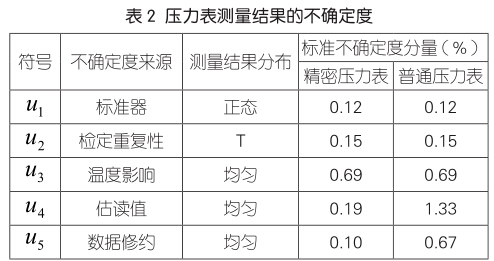 結(jié)合表2可得,\ = V0.559% = 0.74%,則擴展不確定 度U = 1.5%、t = 2,判定其與規(guī)范要求相符。同理,普通壓力表測量結(jié)果的合成標準不確定度\ = ^2.731% =1.65%,