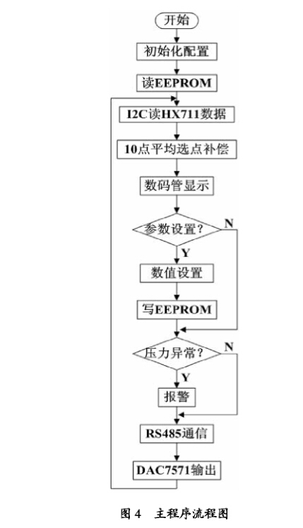 智能氣體壓力表主程序主要包括壓力采集、 10點(diǎn)平均選點(diǎn)補(bǔ)償、數(shù)碼管顯示、異常報(bào)警、 DAC7571模擬量輸出、RS485通信、按鍵掃描和 EEPROM子程序模塊。主程序流程圖如圖4所示。