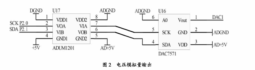 智能氣體壓力表具有模擬量DAC輸出功 能,可直接輸出0—5 V模擬量電壓信號(hào),單片機(jī)與DAC7571通過I2C總線進(jìn)行數(shù)據(jù)傳輸,通過 ADUM1201實(shí)現(xiàn)單片機(jī)與DAC7571外部電氣隔