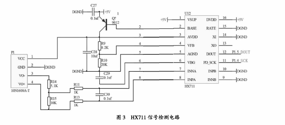10N1600A-T壓力傳感器滿量程輸出電壓 100 mV,HX711傳感器A通道最大輸人電壓在 通道增益為128時(shí)輸人電壓為±20 mV,通道增益 為64時(shí)輸入電壓為±40 mV,即在壓力傳感器輸 出信號(hào)端進(jìn)行電.祖分JS,保證輸出:信號(hào)在HX711 通道A允許輸入范圍,單片機(jī)與HX711通過I2C 總線進(jìn)行數(shù)據(jù)傳輸s。
