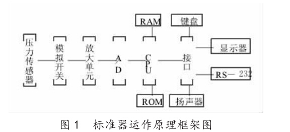 半自動化檢定系統(tǒng)中,標(biāo)準(zhǔn)器的工作原理則是利用 CST2009數(shù)字壓力檢測器,結(jié)合新型集成壓力傳感器與高 精確度的放大單元、A/D轉(zhuǎn)換儀等,針對全量程的溫度差 值實(shí)施嚴(yán)格補(bǔ)償,并運(yùn)用單片機(jī)完成各類參數(shù)的處理、解 析以及運(yùn)算,最后將面板薄膜開關(guān)當(dāng)做操控載體,設(shè)置好 系統(tǒng)內(nèi)部的各項(xiàng)功能。其檢定結(jié)果會通過液晶顯示器或 是RS-235接口從計算機(jī)展示出來。其具體原理框架圖如 圖1所示.