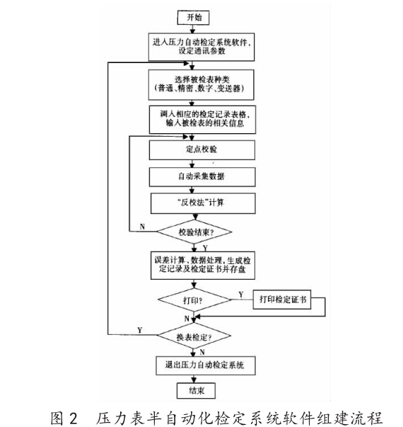 (1)檢定系統(tǒng)軟件的組建。該系統(tǒng)的檢定軟件是在 Windows中文操作系統(tǒng)的管理之下,經(jīng)由visual basic5.0 語言研發(fā)形成。系統(tǒng)在打印過程中會運(yùn)用到word軟件,因 此在操作該軟件時必須要在計算機(jī)內(nèi)安裝word處理工 具。半自動化檢定系統(tǒng)包含了常規(guī)壓力表檢測、高級壓力 表檢測以及壓力變送器檢測這三大流程。在該系統(tǒng)的管 理下,計算機(jī)只能和標(biāo)準(zhǔn)表CST2009的壓力檢測器實(shí)行 通信。而自動搜集數(shù)據(jù)的過程中,該系統(tǒng)也只能搜集到標(biāo)準(zhǔn)表內(nèi)部的壓力數(shù)值與電流、電壓數(shù)值。因此,在對壓力表 實(shí)施檢定時,半自動化檢定系統(tǒng)通常會運(yùn)用“反校定法”進(jìn) 行檢測。該方法主要是利用人工調(diào)控壓力系統(tǒng)中的調(diào)節(jié) 閥門,并把目標(biāo)壓力表的指針固定在某一檢測點(diǎn)上,使壓 力數(shù)值能夠維持在穩(wěn)定狀態(tài)。在檢定軟件的調(diào)控之下,計 算機(jī)可以自動搜集CST2009顯示的數(shù)據(jù),并在程序設(shè)計 過程中利用科學(xué)的運(yùn)算方法把檢測數(shù)值轉(zhuǎn)變?yōu)檎DJ?/span>, 從而使其充分滿足國家計量檢定標(biāo)準(zhǔn)的相關(guān)需求。“反校 定法”的運(yùn)算公式可以表示為:被檢壓力表數(shù)據(jù)(運(yùn)算 =2 x檢定點(diǎn)的實(shí)際數(shù)值-標(biāo)準(zhǔn)表的顯示數(shù)值。半自動壓 力表檢定系統(tǒng)的軟件組建流程如圖2所示.