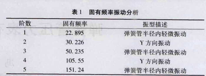 分析彈簧管的固有頻率可以發(fā)現(xiàn),彈簧管的振動存在 半徑內(nèi)和Y方向的這兩種,這也與實際情況是相吻合的。