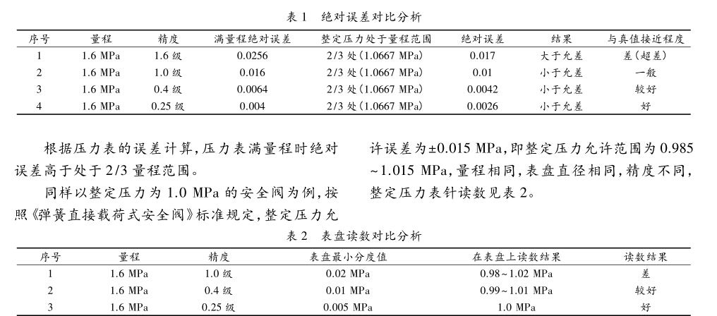 以整定壓力為1.0 MPa安全閥為例,假定量程 相同,表盤直徑相同,按照《彈簧直接載荷式安全 閥》標(biāo)準(zhǔn)規(guī)定,整定壓力允許誤差為±0.015 MPa,選 擇不同精度壓力表,分析測(cè)定結(jié)果(表1)。
