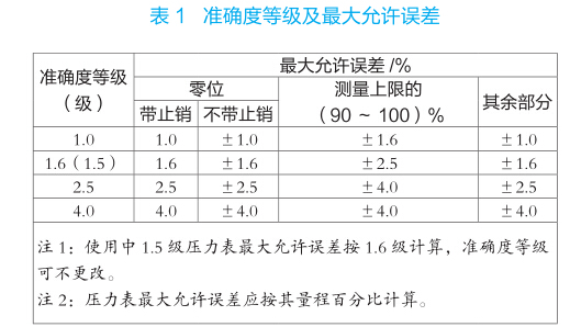 檢定規(guī)程5.1指出,壓力表的準(zhǔn)確度等級及最大允 許誤差應(yīng)符合表1規(guī)定。