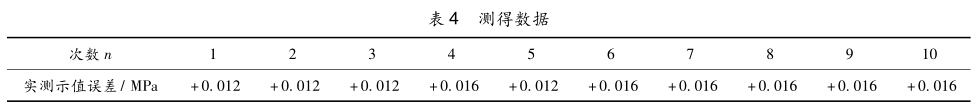 對(duì)一塊0~ 1.6 MPa、1.6級(jí)的壓力表在0.8 MPa點(diǎn)處做10次重復(fù)性測量,測得數(shù)據(jù)如表4 所示。