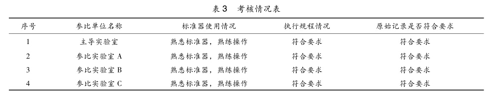 現(xiàn)場由比對(duì)專家組對(duì)參比實(shí)驗(yàn)室的技術(shù)人員 進(jìn)行現(xiàn)場考核,主要是從標(biāo)準(zhǔn)器的使用情況、執(zhí) 行規(guī)程情況、原始記錄是否正確完整等3個(gè)方面 進(jìn)行考核??己饲闆r如表3所示。