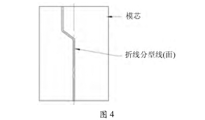 設(shè)計(jì)合理的模具分型面至關(guān)重要,是關(guān)系到坯 料成型、脫模和減少飛邊生產(chǎn)的重要一環(huán)。按照實(shí) 際產(chǎn)品的形狀、規(guī)格及尺寸,進(jìn)行_模_設(shè)計(jì),按不 同的接頭外形,進(jìn)行折線分型,如圖4所示的分型線 (面),使金屬坯料較合理的傾向性流動(dòng)。在凹模 (下模)內(nèi)壁的左右(蝴蝶模)或上下(上下模)分型 面距腔壁約3 ~5 mm處,設(shè)計(jì)一條凹凸型密封線, 通過加大阻尼,防止過多的飛邊產(chǎn)生。