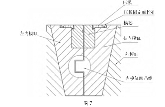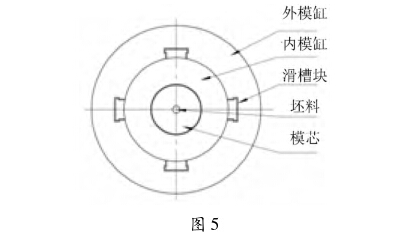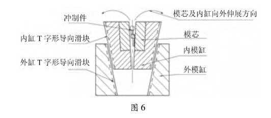 設(shè)計(jì)的模缸由外模缸、內(nèi)模缸及模芯組成,俗稱 抽芯模,如圖5所示。下模的模芯鑲嵌在內(nèi)模缸里 并固定,兩塊模芯用縱向橫向凹凸槽直銷鎖定,內(nèi)模 缸分成左右兩塊,與模芯一樣匹配相鑲成一體,內(nèi)模 缸與外模缸的接觸面互成10° ~12°的傾斜,內(nèi)模缸 分四方各成90°角的位置直接割成4條T字形滑動(dòng) 長塊作為導(dǎo)軌,與其相對應(yīng)的外模缸切割成T字形 導(dǎo)向長槽,導(dǎo)軌在導(dǎo)槽內(nèi)可上下滑動(dòng)。滑塊滑槽既 起導(dǎo)向作用,又起定位作用。4條導(dǎo)向塊、槽,使用 中只用對應(yīng)兩條,磨損到一定程度,相互換位,可延 長一倍的模具壽命。工作時(shí)內(nèi)模缸與模芯在脫模時(shí), 沿著T字滑槽上行,并按模缸的傾度向外伸展,自然 形成脫模。取出制件后,模芯與內(nèi)模缸沿T字滑槽向 下并向內(nèi)閉合,再進(jìn)行第二次沖壓,如圖6所示。