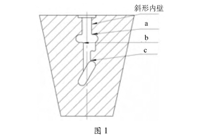 由于壓力表接頭形狀復(fù)雜,有許多形狀不同的 拐角,如圖1中所示的角a、b、c,這種轉(zhuǎn)角在紅沖過 程中阻尼大往往形成死角,坯料無法到位。而無轉(zhuǎn) 角或平行的地方,金屬過多或過早流動(dòng)到頂端而返 回形成“花卷式”卷層,產(chǎn)生拼縫內(nèi)裂。因此模具的 設(shè)計(jì)應(yīng)充分考慮并按金屬在模腔內(nèi)流動(dòng)的規(guī)律,在 需要金屬流動(dòng)的地方,減少其阻力,使其順利流動(dòng), 而不需要流動(dòng)或只需要少量流動(dòng)的地方適當(dāng)加大阻 力,限制或部分限制其流動(dòng)。在保證沖壓制件必須 的外形尺寸和質(zhì)量的前提下,模具的入模角采用斜 形腔面和“r”形,以減少阻力,保證流動(dòng)的金屬材料 經(jīng)擠壓順利到達(dá)每一 “死角”和匯聚到終點(diǎn),真正達(dá) 到滿腔滿盈。一句話,紅沖模具沒有直角。