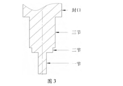 采用多節(jié)上沖頭,使坯料在模具內(nèi)按先后需要 流動(dòng),距離較遠(yuǎn)部分先流動(dòng),距離較近部分后流動(dòng), 保證坯料均勻到位。所謂多節(jié),即按沖頭平面直徑 大小分成二節(jié)或多節(jié),如圖3所示,前端先進(jìn)入的端 面截面積較小,后逐節(jié)加大。上沖模在沖壓過程中, 被先擠壓的金屬坯料一部分與上沖模形成反方向的 流動(dòng),而坯料在反向流動(dòng)過程中,遇到上沖模后一級 (或封口),由于沖模截面增大,金屬坯料受到阻尼, 形成新的阻尼區(qū),由于強(qiáng)大的沖壓力,上沖模的第二 節(jié)、第三節(jié)及封口處,坯料被不斷持續(xù)擠壓,迫使其 不斷遞進(jìn),向前或四周不斷擠展,直至模腔頂壁,從 而使金屬制品的密度也隨之增加。
