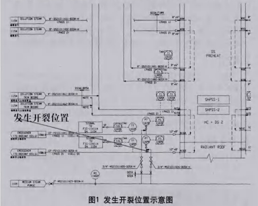 該裂解爐自二月份開工以來,已經(jīng)安全運行4個月,但近 期7#爐高溫橫跨段管線(管件號10”-P21021744-D05X-H) 的壓力表引壓管處出現(xiàn)物料泄露著火事故,使得該爐進行了非 計劃的退料停車,并請專家組前來進行現(xiàn)場調(diào)研,發(fā)現(xiàn)4個通 道的高溫橫跨管連接儀表引壓管處都有大約2cm的裂紋。 設(shè)計的一股吹掃防焦蒸汽的溫度與流經(jīng)此處物料的溫度相差 太大。