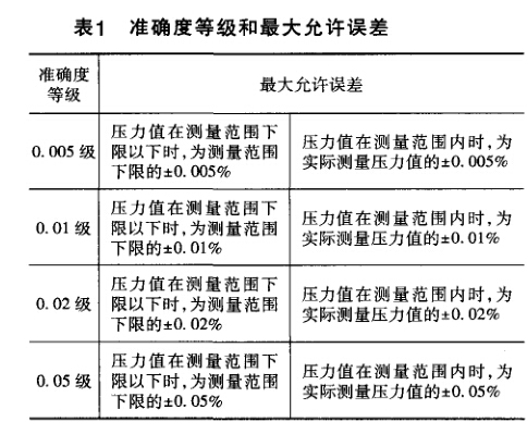 確度等級(jí)是這樣規(guī)定的:“活塞式壓力計(jì)的準(zhǔn)確度等 級(jí)和最大允許誤差應(yīng)符合表1的規(guī)定”。