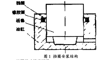 當(dāng)試驗(yàn)的試驗(yàn)機(jī)載荷增加時(shí),系統(tǒng)的壓力也會(huì)隨之增加,但如 果有油液泄露時(shí),試驗(yàn)載荷不會(huì)隨供油的增加而同步升高,即壓力 難以繼續(xù)升髙,油液泄露有內(nèi)泄漏和外泄露兩種情況,外泄露一般 包含油泵異常、閥門(mén)異常和混有氣體等因素,文章不以談?wù)?/span>,主要著 重于內(nèi)泄漏的探討,即擋圈的故障原因。圖1為擋圈安裝結(jié)構(gòu)。