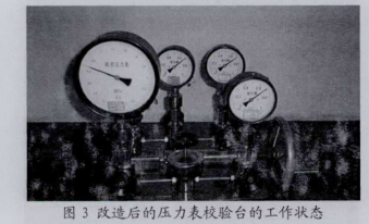 通過對壓力表校驗臺增加表位的改造,提高工 作效率2~3倍,最重要的是有了備用的接口,不 會出現(xiàn)原來接口 一壞,就只能暫時停止工作的局面。 同時采用兩通和三通的閥門來控制油路的開、關(guān), 在必要時能夠選擇使用的接口。改造后的壓力校驗 臺,性能良好,用三塊壓力表同時檢定做試驗,打 壓非常成功;由于有閥門控制,并不影響原有的性 能,值得推廣使用。改造后的壓力表校驗臺的工作 狀態(tài)如圖3所示。