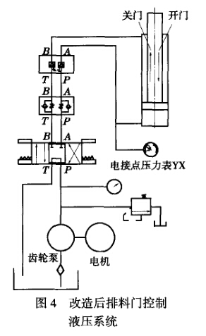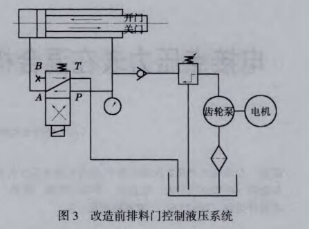 在排料門打開和關(guān)閉過程中,連桿,轉(zhuǎn)臂的動作和液壓缸的 活塞桿縮回或伸出通過機械限位裝置、行程限位開關(guān)及電磁換 向閥配合實現(xiàn).排料門液壓系統(tǒng)見圖3。