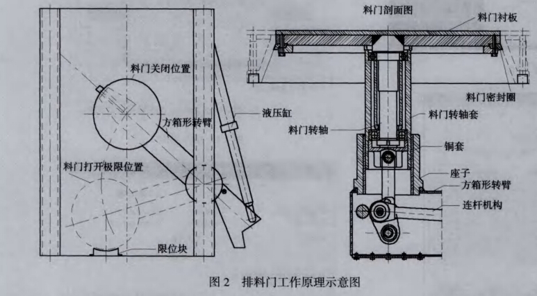 針對排料門無需全部大打 開的實際情況,把原來復(fù)雜的連用原排料門和方箱形轉(zhuǎn)臂.在排 料門下方的方箱形轉(zhuǎn)臂底部的 檢修蓋處安裝一個帶法蘭的小 行程液壓缸,液壓缸活塞桿末端 通過螺紋與排料門的轉(zhuǎn)軸套相 連接,通過活塞桿的伸縮直接驅(qū) 動排料門上下動作’實現(xiàn)排料門 的開關(guān)(圖4)。