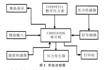為滿足油田壓力儀表現(xiàn)場校驗的需要,提出開 發(fā)一種內(nèi)嵌壓力源、能自動完成校驗過程的一體化 壓力表自動校驗。本系統(tǒng)采用基于C8051F020單片 機的可編程控制系統(tǒng)方案,由壓力發(fā)生器(壓力校驗 栗)、液晶顯示、CONST211數(shù)字壓力表、打印機、系 統(tǒng)校驗軟件以及它們之間的專用通訊電纜構(gòu)成。系 統(tǒng)配以高精度的放大單元及A/D轉(zhuǎn)換器,進行嚴密 的零點及滿量程溫度誤差的補償,用單片機實現(xiàn)各 種數(shù)據(jù)的處理、分析、計算。通過面板薄膜開關(guān)作為 控制鍵盤,實現(xiàn)各種功能的設置。測量結(jié)果由液晶顯 示器顯示或通過RS-232接口輸出至計算機。下面 在系統(tǒng)總體組成框圖的基礎上簡要介紹幾個主要部 分的方案設計。系統(tǒng)總體組成框圖(圖l)。