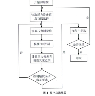 測量系統(tǒng)軟件有以下幾個模塊:鍵盤控制模塊, 顯示模塊,計算及控制模塊,通訊控制模塊等,軟件 控制由C8051F020單片機實現(xiàn)首先數(shù)字壓力表 產(chǎn)生的壓力通過標準RS-232協(xié)議傳給單片機,單 片機接受鍵盤發(fā)的控制命令,運行對應的控制程序, 產(chǎn)生控制輸出,控制壓力發(fā)生器工作,產(chǎn)生相應的測 試壓力。同時在液晶顯示器上顯示相應的控制命令 和壓力輸出值,另外可根據(jù)需要進行打印輸出。在這 —過程中,如果壓力傳感器測得的壓力值超限,系統(tǒng) 將自動泄壓,以保護人員及設備安全。單片機軟件流 程(圖4)。