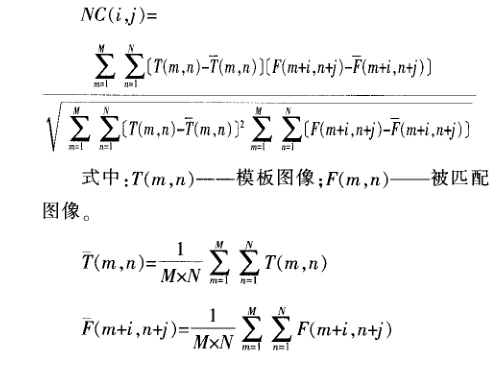 歸一化互相關(guān)匹配(Normalized Correlation,NC) 算法是一種經(jīng)典的匹配算法。具有很高的準(zhǔn)確性和適 應(yīng)性,對圖像灰度值的線性變換具有“免疫性”,即所 求的NC值不受灰度值線性變換的影響。通過計算模 板圖像和待匹配圖像的互相關(guān)值來確定匹配的程度。 互相關(guān)定義如下: