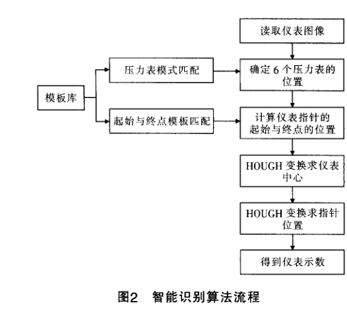國內(nèi)外提出了很多儀表識別方法:2006年,潘偉 等人利用脊波變換方法對幾種含噪聲的圖像進(jìn)行直線 檢測,結(jié)果表明脊波變換能較好地提取直線特征。同年, 唐敏等人提出了一種基于自適應(yīng)脊波變換的邊緣檢測 方法。這種方法以脊波變換為理論基礎(chǔ),具有多方向和 多尺度性,能對圖像中不同方向的邊緣特征進(jìn)行有效表 示和檢測。李盛陽、葉梧等利用圖像形態(tài)骨架細(xì)化方法 和Hough變換對指針式儀表讀數(shù)進(jìn)行識別。Correa.Ale_ gria等介紹了利用機器視覺對指針式儀表的檢定過程。 首先采用攝像頭采集全局的表盤圖像,然后用減影法將 兩個不同位置的指針圖像保留下來,再利用Hough變換 得到指針的角度,之后將原始圖像做幾何變換,使得表 盤上的刻度線成為一條水平線并與指針垂直,然后得到 指針的讀數(shù)。筆者所設(shè)計系統(tǒng)要求每次對6個壓力表進(jìn) 行識別,上述方法不能直接應(yīng)用到系統(tǒng)中。