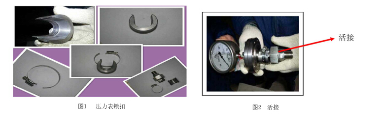 經(jīng)過此次改造還解決了在平時安裝壓力 表的過程中存在的問題,就是在壓力表安裝 到管線上后,有時表盤的位置處在不易觀察 的方向,造成巡檢人員觀察的難度,考慮到 這種情況,在研制鎖扣的過程中,增加了一 個活接(圖2 ),這種活接的加人解決了壓 力表盤方向的問題,它能使壓力表表盤隨便 更改方向,方便巡檢人員的觀察。