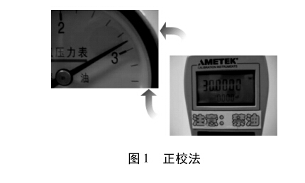 什么是正校法?我們可以查看國家計量檢定規(guī) 程《JJG52 -1999彈簧管式一般壓力表、壓力真空表 和真空表》m中“5. 3. 3. 3條款中對示值的檢定方 法”就是對正校法的說明。簡單的說就是把標準表 升壓(降壓)到標準壓力,然后讀取被檢表數(shù)值。如 圖1所示: