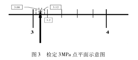 在圖3中把指針指向位置明確的顯示出來,由于正校法只能估讀最小分度值的1/5,所以應為 3. 08MPa和3. 12MPa之間選取,在檢定時估讀的數(shù) 值是3.12MPa。為了能使結果判定的更加準確,減 小風險,只能是擴大誤差,所以按讀大不讀小的原則 讀取的數(shù)值為3.12MPa。