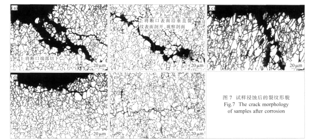 斷裂螺栓螺桿的化學(xué)成分中鉻、鎳的含量偏低, 錳、銅的含量偏高,不符合GBSS304的要求,為不合格的A2-70螺栓,這極大地降低了螺栓的耐蝕性。 同時(shí),螺桿表面粗糙,有很多加工缺陷’這些都可以 成為點(diǎn)蝕,甚至是腐蝕裂紋的起始點(diǎn)。金相檢查結(jié) 果表明,有碳化物沿晶界分布,而裂紋均沿晶界擴(kuò) 展。這可能是因?yàn)槁菟ú牧线M(jìn)行熱處理時(shí),由于熱處 理制度不當(dāng),造成碳化物(Fe、Cr)aC6從奧氏體中析 出而分布在晶界上[5]。這種碳化物的鉻含量高于奧 氏體基體,它的析出消耗了晶界附近大量的鉻,而 消耗的鉻不能從晶粒中通過擴(kuò)散及時(shí)得到補(bǔ)充,因 為鉻的擴(kuò)散速度很慢,所以造成晶界附近的含鉻量 低于鈍化必須的限量,形成貧鉻區(qū),因而鈍態(tài)遭到破 壞,提高了螺栓晶間腐蝕的敏感性。因此,在應(yīng)力和 腐蝕介質(zhì)(微泄漏的氯氣)的共同作用下,以晶間腐 蝕為起源,發(fā)展成應(yīng)力腐蝕開裂,導(dǎo)致螺栓的斷裂。