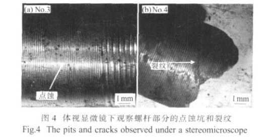 圖4為體視顯微鏡下觀察螺桿部分的點(diǎn)蝕坑和裂紋??煽闯?,在螺栓斷口附近的螺桿表面發(fā)現(xiàn)點(diǎn)蝕坑以及裂紋。另外,從圖4還可看出,螺桿表面粗糙 不平。
