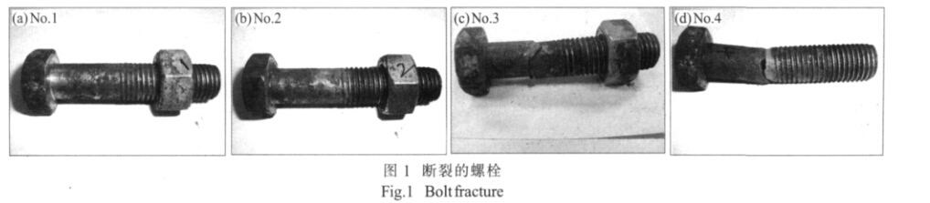 該法蘭上斷裂螺栓的圖片見圖1。在法蘭上共有四支螺栓,其中兩支斷裂,斷裂均發(fā)生在螺桿的非螺紋部分,如圖1(c)、(d)所示。