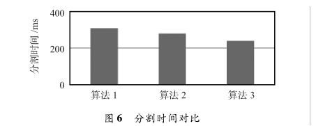 根據(jù)圖6可知分割時(shí)間為:二維Otsu算法310 ms; Otsu 雙閾值算法280 ms;改進(jìn)二維Otsu算法Otsu雙閾值算法延續(xù)二維Otsu算法優(yōu)點(diǎn),效果優(yōu)于傳統(tǒng) 二維Otsu算法,但還是存在部分陰影影響識(shí)別;最后使用了 本文改進(jìn)二維Otsu算法,很大程度彌補(bǔ)了丟失的信息且消 除陰影,分割效果更優(yōu)。三種分割算法的處理時(shí)間如圖6 所示。