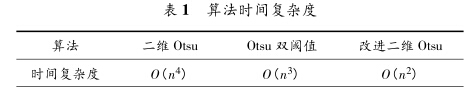 隨著模塊n的增大,算法執(zhí)行時(shí)間的增長(zhǎng)率和/(n)的 增長(zhǎng)率成正比,因而/(n)越小,算法的時(shí)間復(fù)雜度越低,算 法的效率越高。所以,傳統(tǒng)二維Otsu閾值分割算法因?qū)?s, t)雙重循環(huán)使得運(yùn)算次數(shù)增加,而改進(jìn)二維Otsu閾值分割 算法因添加離差平方和計(jì)算需再對(duì)角線窄帶區(qū)域進(jìn)行遍 歷,但由于窄帶面積較小,故計(jì)算次數(shù)遠(yuǎn)少于傳統(tǒng)二維Otsu 算法,降低時(shí)間復(fù)雜度,減少了運(yùn)算時(shí)間。