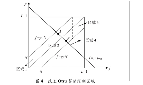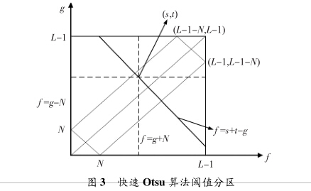 在上述計(jì)算中,/ = g - N和f = g + N兩條輔助線已經(jīng)劃 分了目標(biāo)類和背景類的像素區(qū)域,所以,(s,t)閾值組合也 需滿足該區(qū)域,即滿足如下限制條件 (■0^/^^N Wg^f + N rN^f^L - N