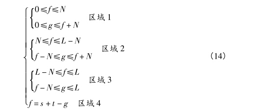其中,第4分區(qū)是必須滿足的,即s +1組合的點(diǎn)必定在 直線f = s + t -g上,其余的3個(gè)區(qū)域中至少滿足一個(gè)區(qū)域。 如圖4所示B兩點(diǎn)滿足區(qū)域4和區(qū)域2,且假設(shè)s + t組 合最佳位置處,s + t可以分解為A( sj, t1)和B( s2, t2)兩點(diǎn), 則分別將IB兩點(diǎn)作為最佳閾值點(diǎn)進(jìn)行計(jì)算比較。