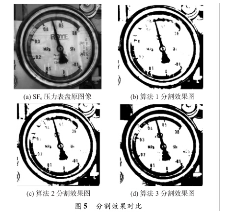 本文基于SF6壓力表盤圖像對(duì)比了傳統(tǒng)二維Otsu和 Otsu雙閾值,給出了一種改進(jìn)的二維Otsu算法。算法將整 體閾值再區(qū)分并結(jié)合離差平方和作為適應(yīng)度函數(shù)選取最佳 閾值,不僅滿足對(duì)圖像進(jìn)行目標(biāo)區(qū)域分割,同時(shí)具有更高的 穩(wěn)定性、快速性和分割精度。