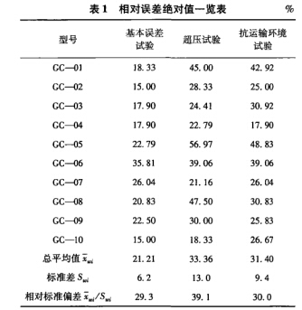 (2)相對標準偏差反映了各次試驗中樣本相 對誤差絕對值的分散程度,可以看出,基本誤差試驗和抗運輸環(huán)境試驗的值很接近,而超壓試驗 超出基本誤差試驗和抗運輸環(huán)境試驗約1/3,說明 超壓實驗加強了樣本相對誤差絕對值的分散性, 從而能夠反映出各樣本壓力表的抗超壓性能,結(jié) 果表明各樣本所用的彈性元件抗超壓性能差別 較大。