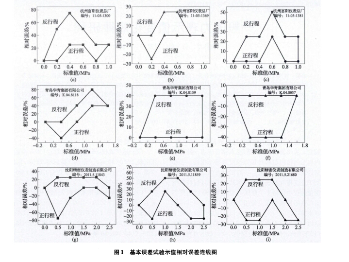(1)基本誤差試驗相對誤差的連線以逆時針 形成閉合回路,連線無交疊,相同測量點反行程 示值恒大于或等于正行程示值。正、反行程示值 在量程中間區(qū)域達到最大值,反行程的示值最大 值為壓力表最大示值。