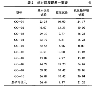 (2)抗運輸環(huán)境試驗的相對回程誤差值明顯 大于超壓試驗值而略小于基本誤差試驗值。說明 在經(jīng)過一段時間的自然時效及抗運輸環(huán)境試驗后, 彈性元件得到一定程度的回復(fù),因此進行示值試 驗時能夠產(chǎn)生一定程度的殘余變形,導(dǎo)致回程誤 差增大。