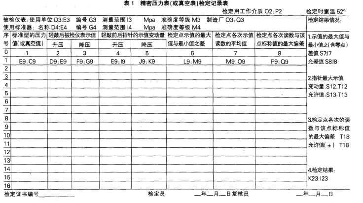 針對(duì)0.4級(jí)與0.6級(jí)彈簧管式精密壓力表檢定處理模型文 章利用excel軟件進(jìn)行了編制。該模型的檢定證書可以直接來(lái)用錄 入信息來(lái)填充,對(duì)于可能出現(xiàn)的數(shù)據(jù)處理錯(cuò)誤有規(guī)避作用,檢定的效 率也能夠有效提高。
