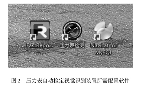 壓力表自動檢定視覺識別裝置所需配置軟件 如圖2所示。軟件部分的主程序使用C#編寫,使用MySQL數(shù)據(jù)庫儲存檢定數(shù)據(jù),使用FastReport出具 證書。