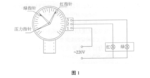 有一個(gè)常閉開(kāi)關(guān)和一個(gè)常開(kāi)開(kāi)關(guān),就 是利用壓力表了解電接點(diǎn)壓力表的結(jié)構(gòu)后,再把電接點(diǎn)壓力表的 工作過(guò)程簡(jiǎn)單的介紹一下:通過(guò)轉(zhuǎn)動(dòng)安在玻璃蓋外面的 旋鈕,先將下限指針設(shè)定在需要的壓力值上,后將上限指 針設(shè)定在需要報(bào)警的壓力位置上。當(dāng)被測(cè)介質(zhì)壓力進(jìn)入 彈簧管內(nèi),在壓力作用下彈簧管自由端產(chǎn)生位移,經(jīng)齒輪 傳動(dòng)機(jī)構(gòu)放大后,指針在表盤(pán)上指示出壓力值的同時(shí),帶 動(dòng)電接點(diǎn)裝置的活動(dòng)觸頭,當(dāng)超過(guò)下限設(shè)定的壓力時(shí),壓 力表的指針上機(jī)械部分將常閉開(kāi)關(guān)斷開(kāi),如圖1中綠燈 熄滅。壓力繼續(xù)上升,當(dāng)壓力超過(guò)上限指針設(shè)定的值時(shí), 壓力表指針上的機(jī)械部分將常開(kāi)開(kāi)關(guān)閉合,如圖1此時(shí)紅燈 被接通電源,紅燈亮,提示壓力已經(jīng)超過(guò)設(shè)定上限值,需要采 取措施使壓力下降到上限值以下,這樣才安全。