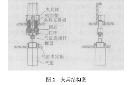 裝夾工件為雙針壓力表底座(如圖1b所示),檢測 氣體從壓力表底座的兩螺紋接口中心孔通入,其夾具 結(jié)構(gòu)如圖2所示,將雙針壓力表底座螺紋部分裝入夾 具體,當夾緊氣缸缸桿伸出,通過氣缸連接軸、缸桿,推 動兩頂芯向上運動,直到壓力表底座螺紋端部壓緊密 封墊并夾緊工件。密封墊材料采用聚氨酯,以延長其 使用壽命。夾具體與雙針壓力表底座螺紋配合部分尺寸應基本一致,以防止夾緊時夾緊力為單邊作用力使 工件傾斜導致密封效果差的問題。檢測氣體從頂芯的 兩中心孔分別進入到壓力表底座的兩螺紋接口的中心 孔以實現(xiàn)壓力表密封性檢測。當夾緊氣缸缸桿返回時,工件松開。